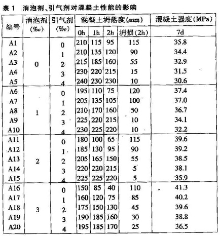 外加劑摻量為膠凝材料的1%,聚羧酸系減水劑復配不同比例消泡劑和引氣劑對混凝土性能的影響見表1。