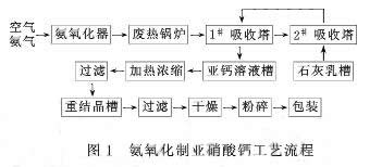 氨和空氣在氧化爐內(nèi)高溫、鉑催化劑作用下反應(yīng)生成氧化氮,經(jīng)廢熱鍋爐回收熱量后,連續(xù)進(jìn)入1號石灰乳吸收塔、2號吸收塔與塔頂噴灑下來的石灰乳液逆流接觸進(jìn)行中和反生成亞硝酸鈣溶液。亞硝酸鈣溶液放入亞硝酸鈣溶液槽,經(jīng)加熱濃縮后過濾、冷卻、包裝就成為亞硝酸鈣成品了。原理圖如下: